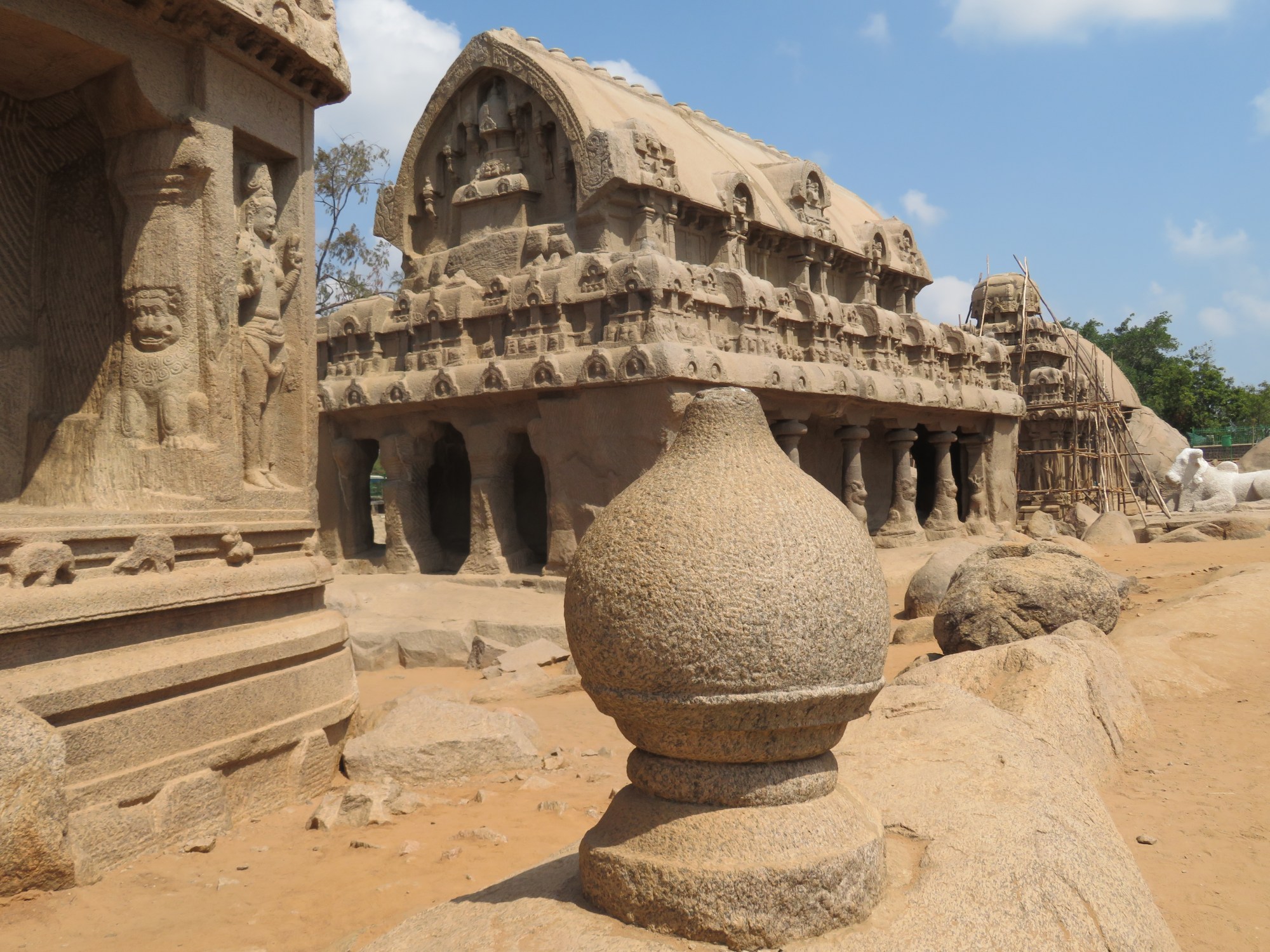 Nous commençons par les 5 rathas et prenons un jeune guide qui nous fait la visite en français. Il est fier de nous dire qu’il n’a pas appris le français à l’école mais uniquement avec les touristes. De temps à autre il nous demande la traduction d’un mot à partir de l’anglais. La visite est très intéressante et le site est fabuleux. Difficile de concevoir que tout a vraiment été sculpté dans un unique bloc. Aucun rajout.