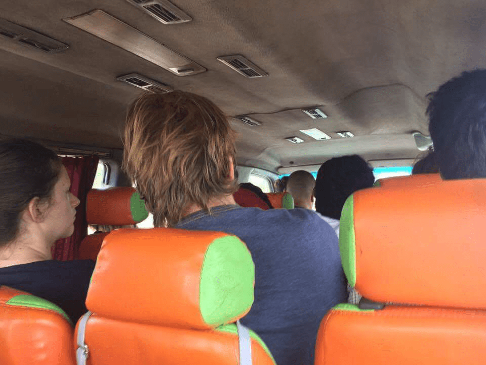 Debout 6h30 ce matin, on doit venir me chercher à la Guesthouse à 7h20 pour rejoindre le mini-van prévu partir à 8h pour Banlung. Je sors donc devant la maison pour être prête à partir sans perdre de temps. 7h30, personne, 7h45 je commence à être inquiète et retourne à la Guesthouse demander au propriétaire s’il peut appeler l’agence auprès de laquelle j’ai réservé. Il est trop tôt, personne ne répond. Puis au bout de la 3ème tentative, il a enfin un interlocuteur. On lui répond que je ne dois pas m’inquiéter. Mais quand même… 8h00, 8h10… rien. On rappelle, toujours la même réponse. 8h20 ; je vois une petite moto arriver en trombe. Le chauffeur me demande si c’est bien moi qui vais à Banlung, j’acquiesce, il me dit de monter… J’ai mon gros sac sur le dos, le petit devant, et on case le reste à l’avant de la moto. Il parcourt environ 1 km avant de me déposer devant une autre guesthouse où d’autres voyageurs comme moi attendent, l’air passablement contrariés. Une femme assise devant une table de fortune dans la cour me demande mon ticket, et note mon nom sur sa liste. Je lui demande à quelle heure nous partirons. Elle marmonne « bientôt… », mais pour l’instant aucun mini-van à l’horizon. Enfin à 8h45, il arrive. Nous prenons place. Il n’y a là que des backpackers comme moi, dont 2 ou 3 allemands ou hollandais bien costauds. Les sièges sont très étroits, visiblement fait pour les morphologies asiatiques… Une chance je me retrouve tout au fond sur un siège sensé être double, mais parfait pour moi seule. Je me réjouis de savoir que je ne vais pas souffrir autant que d’autres qui sont vraiment très mal installés sur leur siège trop petit. Pas tellement de place pour les jambes non plus, mais bon, en me mettant en biais… Une fois tous les bagages casés sous les sièges (on a les pieds dessus en fait), le mini-van démarre. Nous prenons enfin la route.